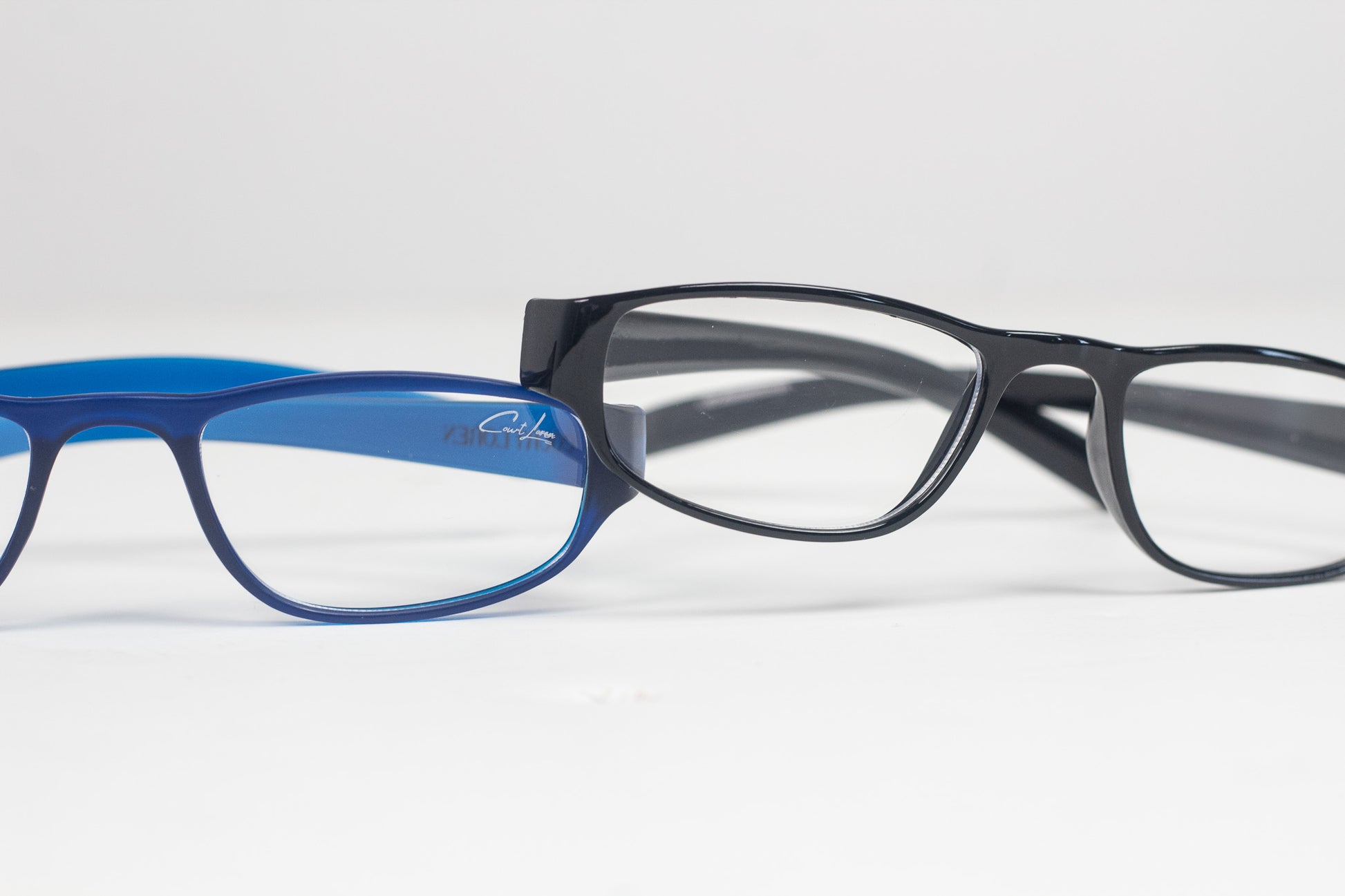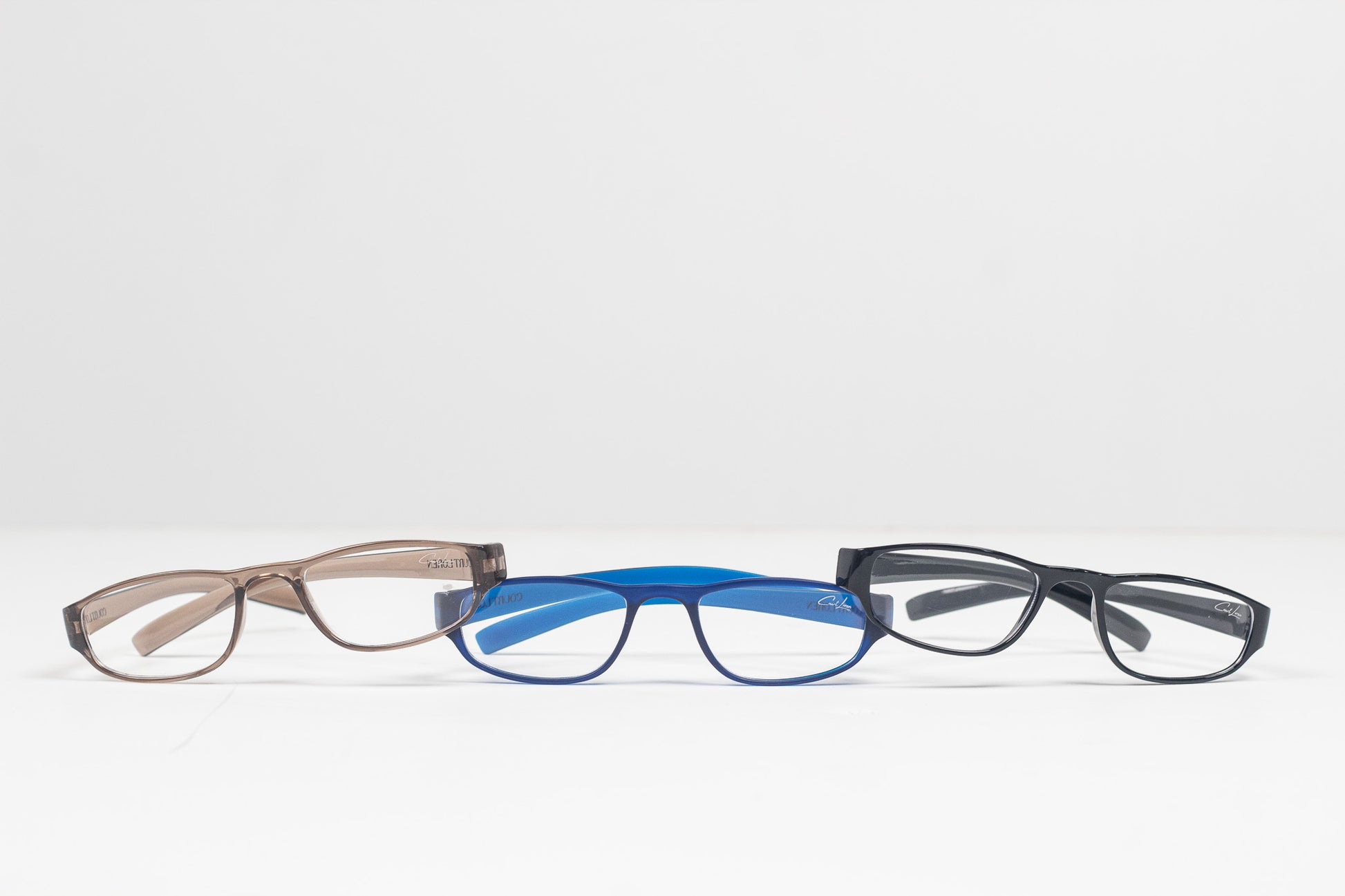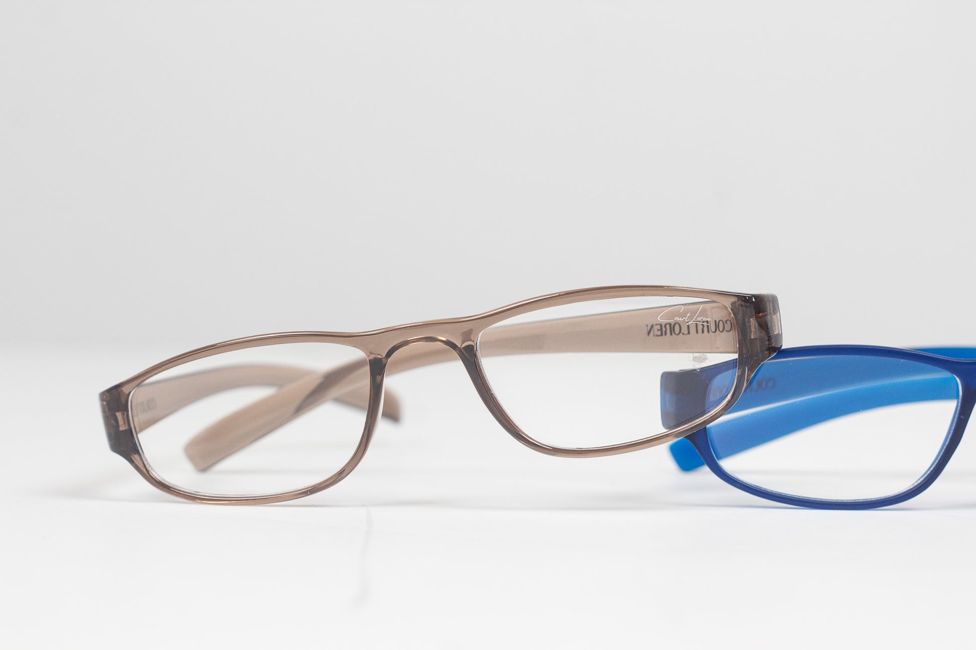 Blue frames are matte finish, Brown and Black are Glossy, all with silver Courtloren logo detail